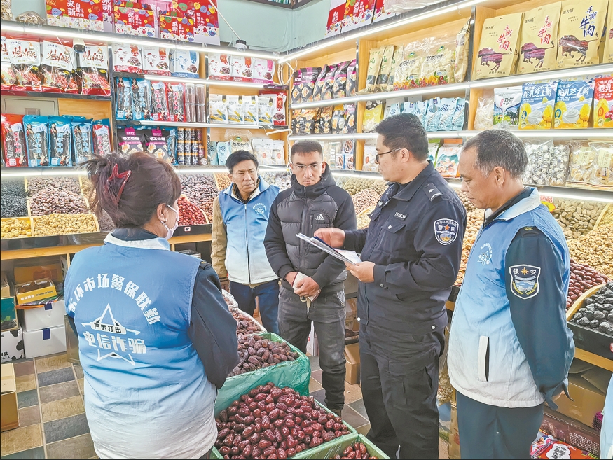 12月3日,乌市公安局天山区分局黑甲山派出所民警向商户讲解反诈知识。 徐伟豪 摄