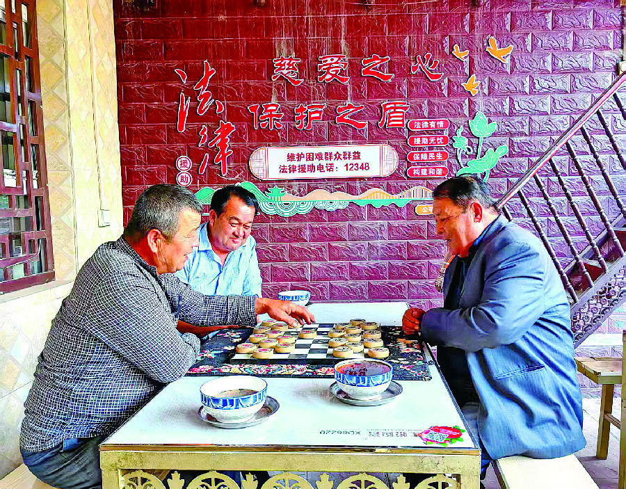 近日,群众在沙雅县忠孝茶馆喝茶、下棋、学习法律知识。 石榴云/新疆法治报记者 王晨 摄