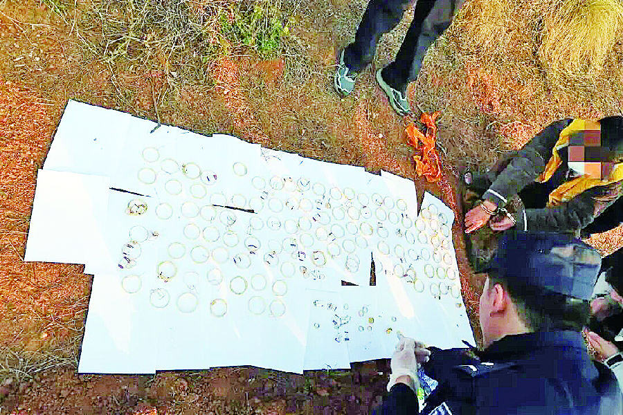 民警现场清点被盗黄金。