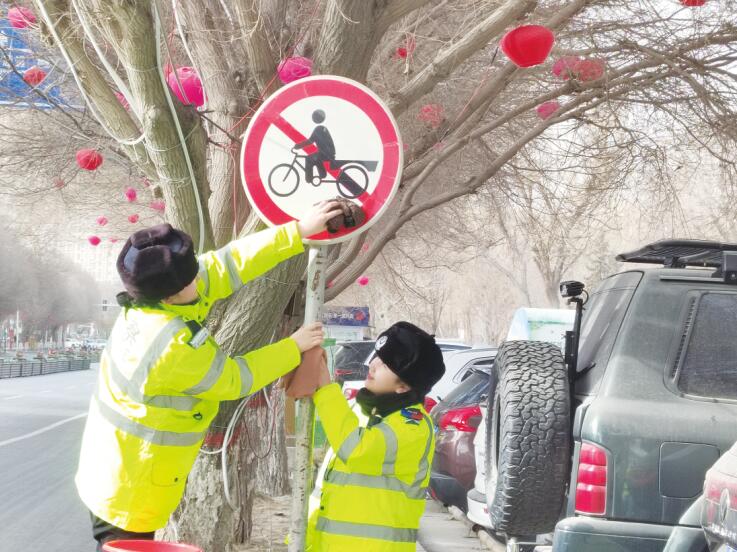 3月4日,库尔勒市公安局交警大队骑警中队民辅警在萨依巴格路擦拭交通标志牌。