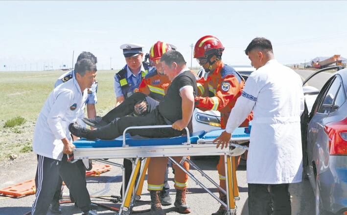 5月15日,托里县公安局交警大队民警协助相关人员,将“受伤”群众抬上担架。