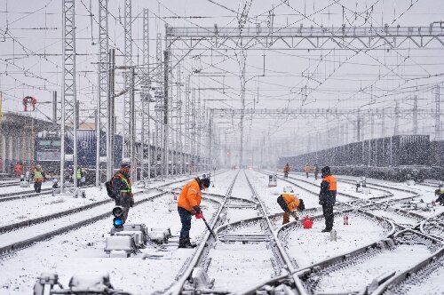 ③在乌鲁木齐西站,铁路工作人员及时清除线路积雪。 摆风亮 摄