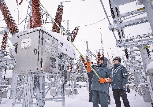 ④在阿勒泰地区喀纳斯景区,国网阿勒泰供电公司运维人员对设备进行清雪作业。