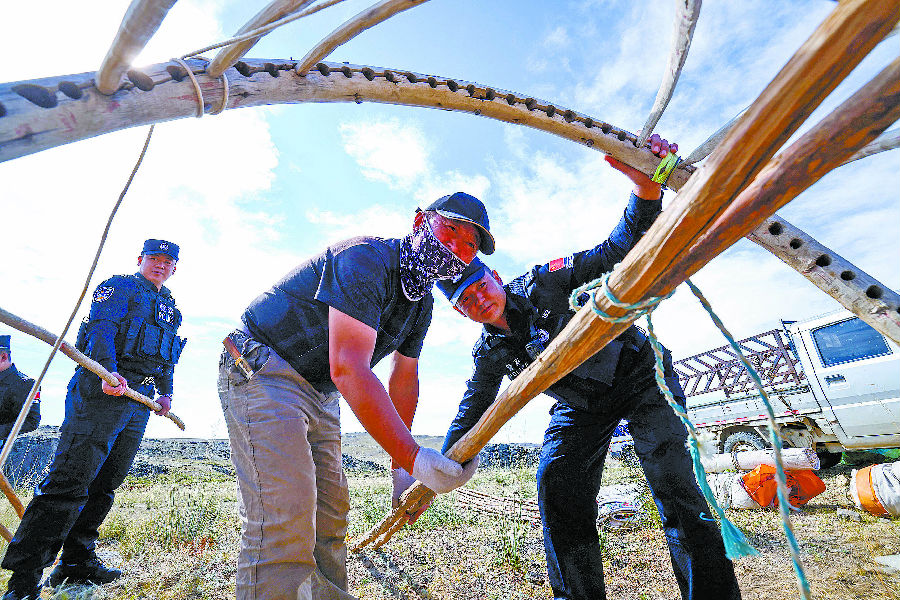9月5日,新疆出入境边防检查总站阿勒泰边境管理支队福海边境管理大队民警帮助牧民搭建毡房。 王友波 摄
