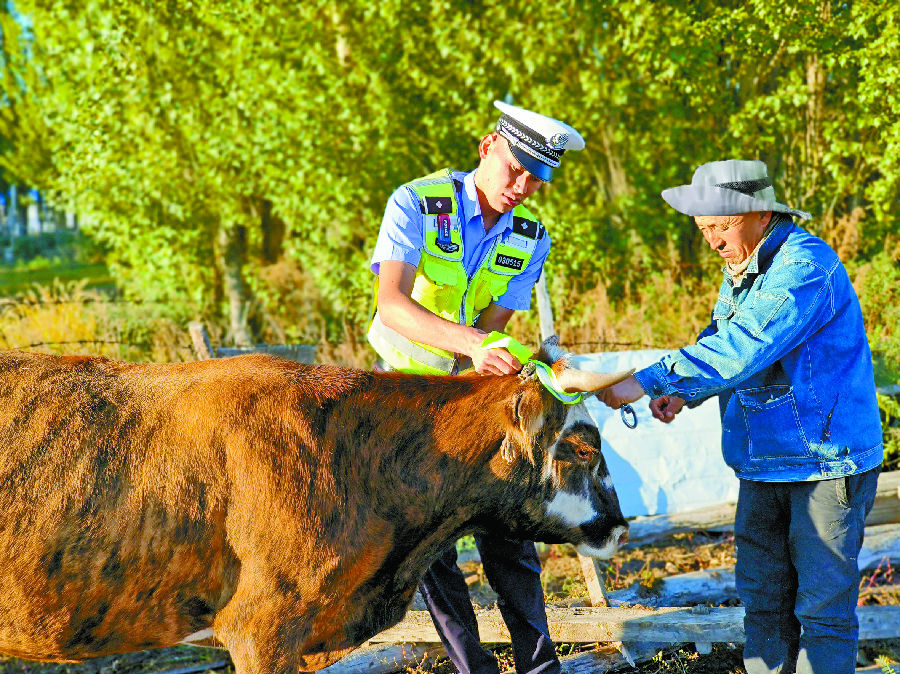 9月9日,哈巴河县公安局交警大队民警为牲畜捆绑反光带。