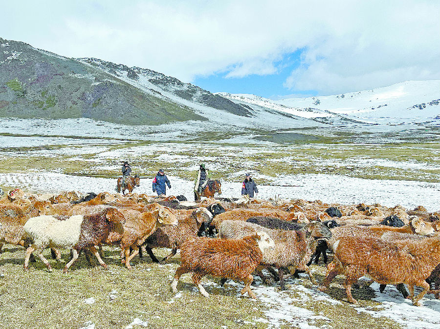 9月8日,富蕴县山区突然降雪,新疆出入境边防检查总站阿勒泰边境管理支队吐尔洪边境派出所民警护送牧民转场。 金磊鑫 摄
