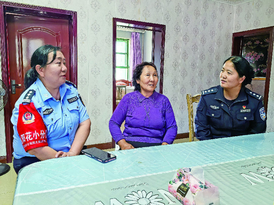 9月15日,沙湾市公安局大泉乡派出所所长张雪娇(右一)在居民家中走访。 岳倩茹 摄