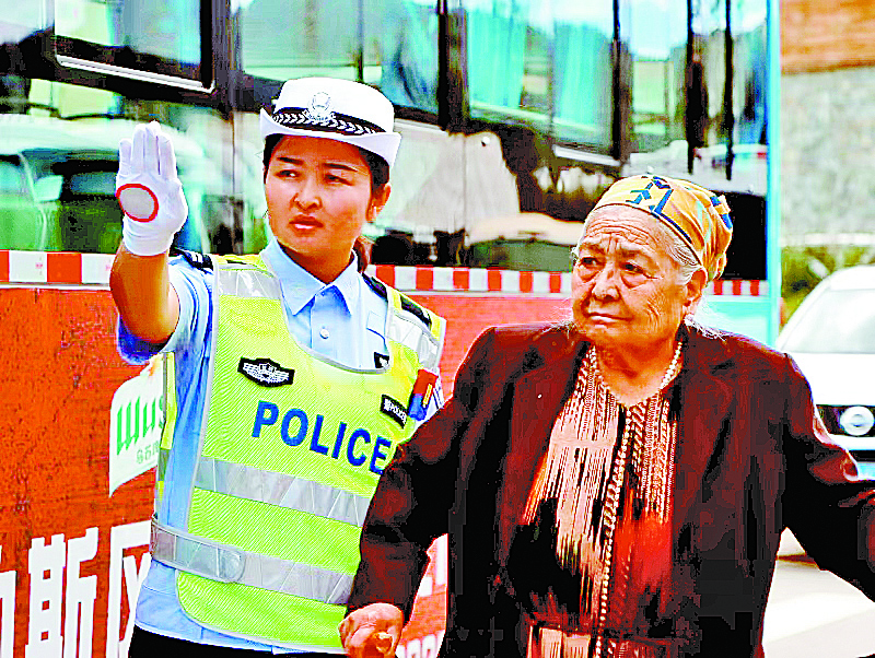 8月13日,在喀纳斯贾登峪白桦林野奢营地游客换乘点,喀纳斯景区公安局交警大队辅警古丽娜孜·阿拉尔汗搀扶行动不便的老人前去乘车。连日来,为应对客流高峰,该大队科学调配警力,设立交通咨询点、爱心执勤岗,开展车辆分流、服务保障等工作,确保景区道路交通安全有序。 张晓 摄