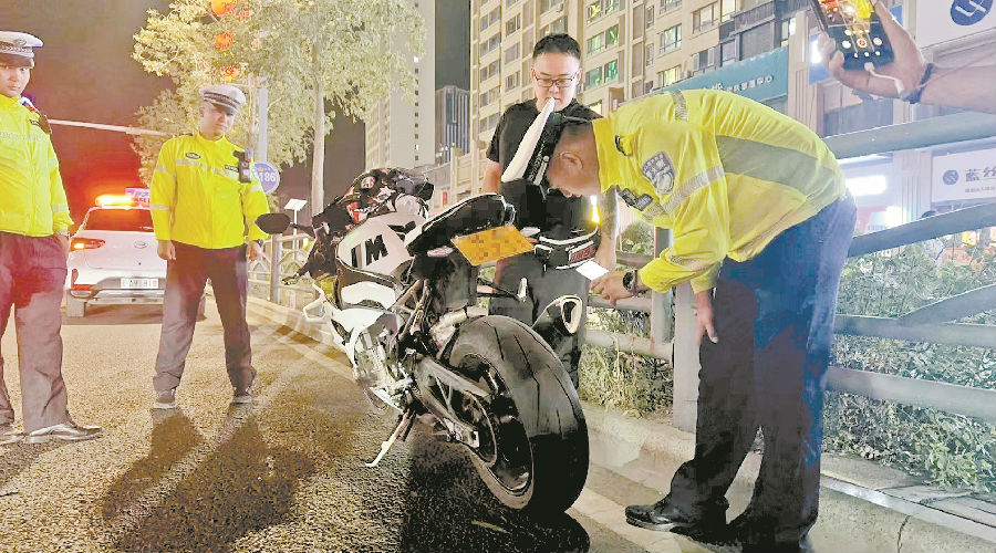 8月13日凌晨2时许,民警检查疑似非法改装摩托车。