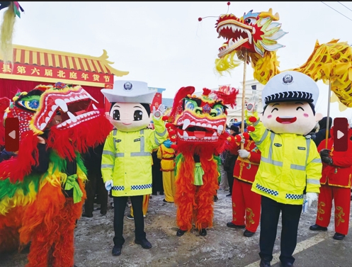 2023年12月30日,第六届“北庭年货节”开幕,吉木萨尔县公安局交警大队民警穿戴玩偶服来到现场,给过往群众送精美礼品和安全知识手册,讲解“一盔一带”重要性、酒驾醉驾危害等交通安全法律知识,在轻松愉快的氛围中增强群众安全出行意识。图为民警与开幕式表演团队召集过往群众参与交通安全宣传活动。王静 摄