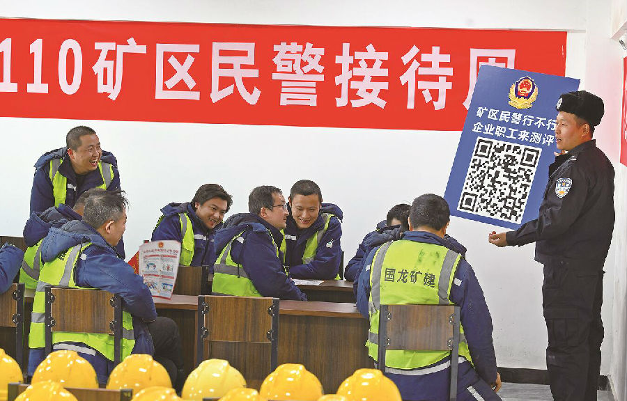 1月7日,新疆出入境边防检查总站昌吉边境管理支队北山煤矿边境派出所民警来到辖区矿区企业,通过“码上点评”“线下收集”的方式开展年度110矿区民警接待周评警活动,并集中宣传《中华人民共和国民法典》。图为民警通过“码上点评”的方式收集企业员工意见建议。 周游 摄