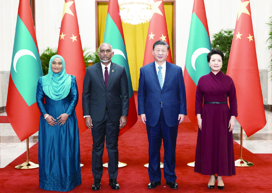 1月10日下午,国家主席习近平在北京人民大会堂同来华进行国事访问的马尔代夫总统穆伊兹举行会谈。这是会谈前,习近平和夫人彭丽媛在人民大会堂北大厅为穆伊兹和夫人萨吉达举行欢迎仪式。 新华社记者 黄敬文 摄