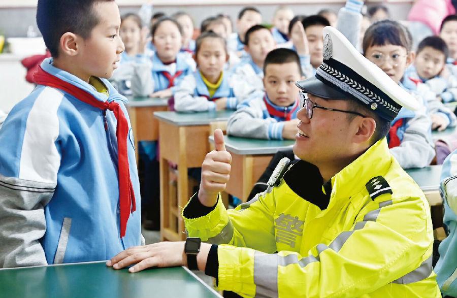 图为民警向正确回答交通安全问题的同学点赞。 石榴云/新疆法治报记者 单坤 摄