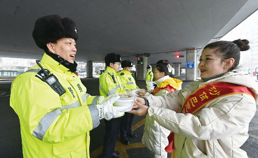 1月17日,乌鲁木齐市沙依巴克区八一街道工作人员为乌市公安局交警支队沙依巴克区大队西北路中队民辅警送上腊八粥。