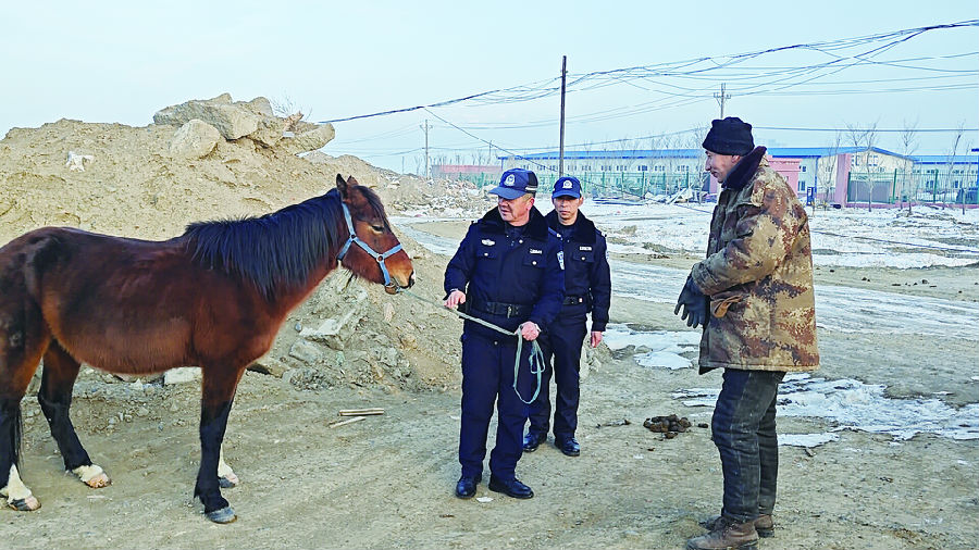 1月10日,乌鲁木齐市公安局沙依巴克区分局仓房沟派出所民警和马主人交接马匹。 郁元平 摄