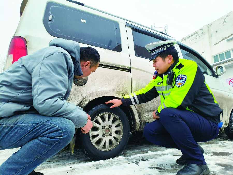 1月17日,伊宁县公安局交警大队民警抽检辖区客运车辆,确保冬季交通安全。民警来到客运站,重点检查车辆安全带、灭火器、雪地胎、雨刮器及乘客安全带规范使用等情况,提醒驾驶人做好冬季出行安全措施。同时,民警还向驾驶人宣讲遵守道路交通法规的重要性,提醒驾驶人及乘客摒弃交通陋习,牢固树立安全出行意识。图为民警检查车辆轮胎。 马玉梅 摄
