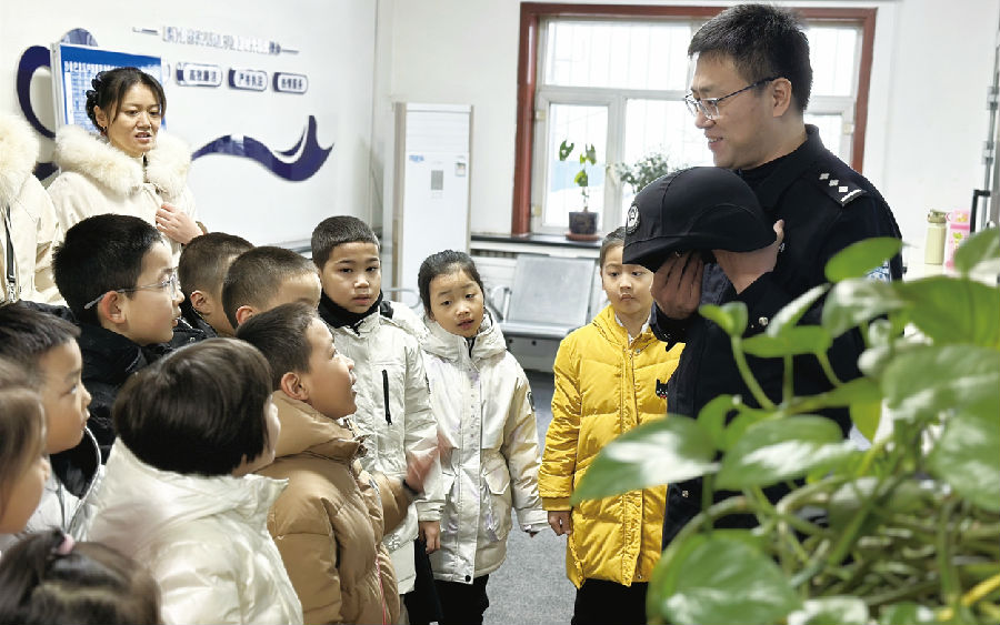 “警察叔叔,这个棍子怎么用?”“我可以戴一下警用头盔吗?”从头盔、盾牌到警用单警装备,民警为学生们介绍了各类警械装备的名称、功能及使用方法,让学生们圆了一回“警察梦”。图为民警向学生们介绍警用头盔的作用。