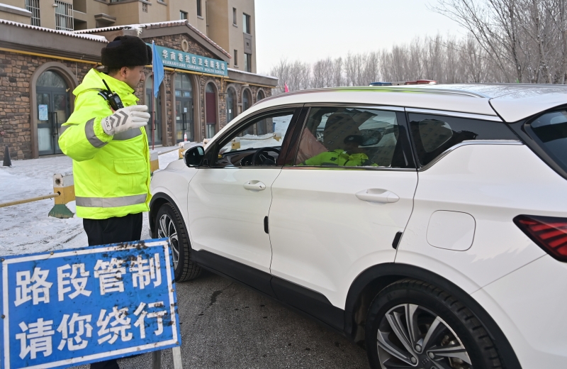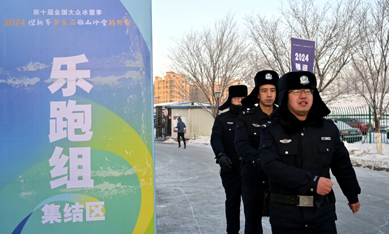 乌鲁木齐市公安局沙依巴克区分局环卫路派出所民辅警在雪地越野赛比赛现场执勤。石榴云/新疆法治报记者 单坤摄