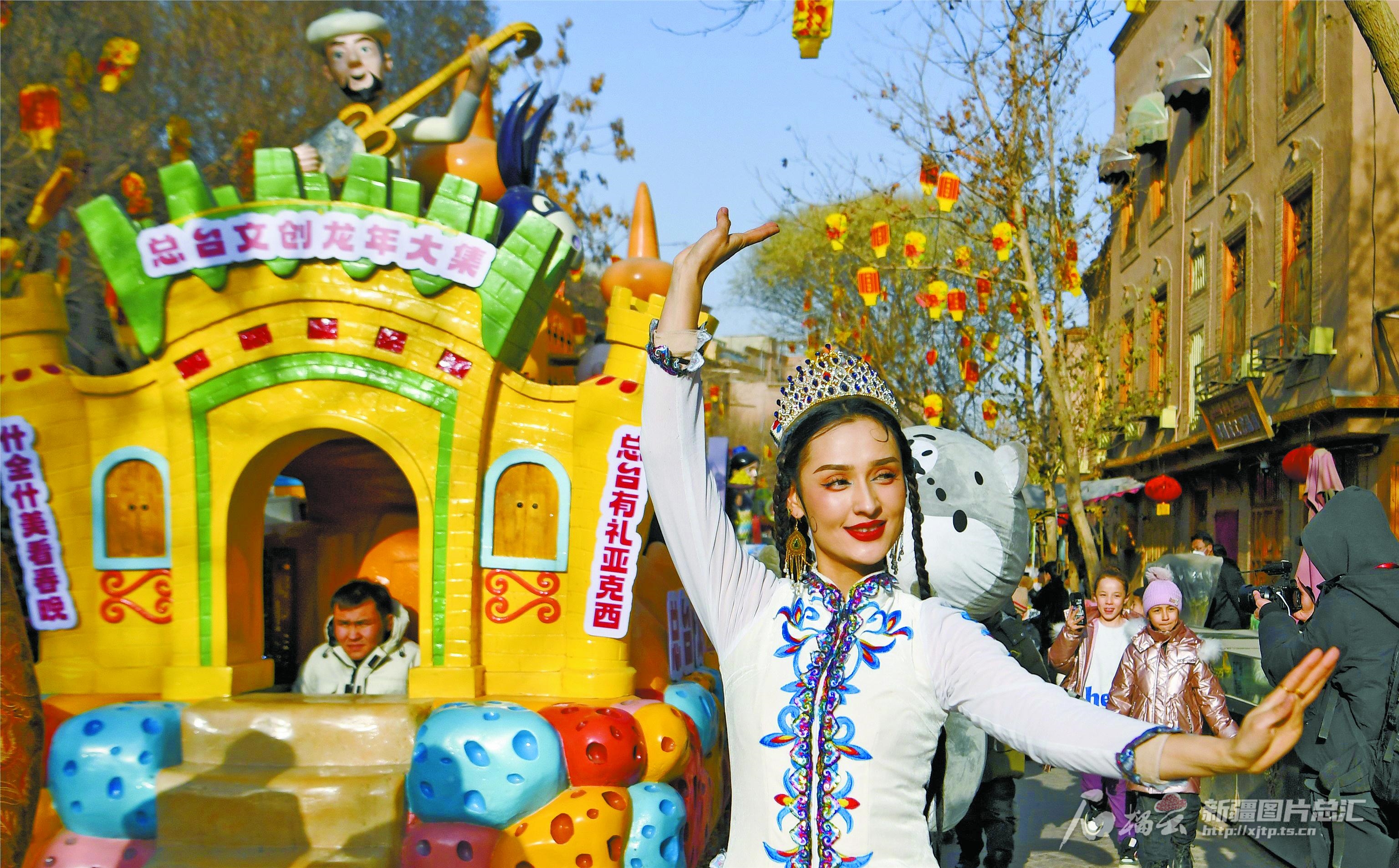 浙江游客徐沪婵是第一次来新疆,来之前她就知道中央广播电视总台2024年春节联欢晚会在喀什设立分会场。在古城拍照时,听到身后有音乐声响起,一回头就看到了花车。“很惊喜,花车很有特色,还看到了‘龙辰辰’,感受到了浓浓的春节氛围。”她说。