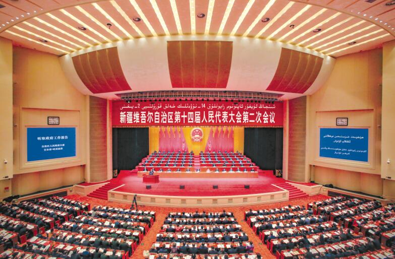 一月三十日,新疆维吾尔自治区第十四届人民代表大会第二次会议在新疆人民会堂开幕。图为会议现场。石榴云/新疆日报记者 蔡增乐 摄