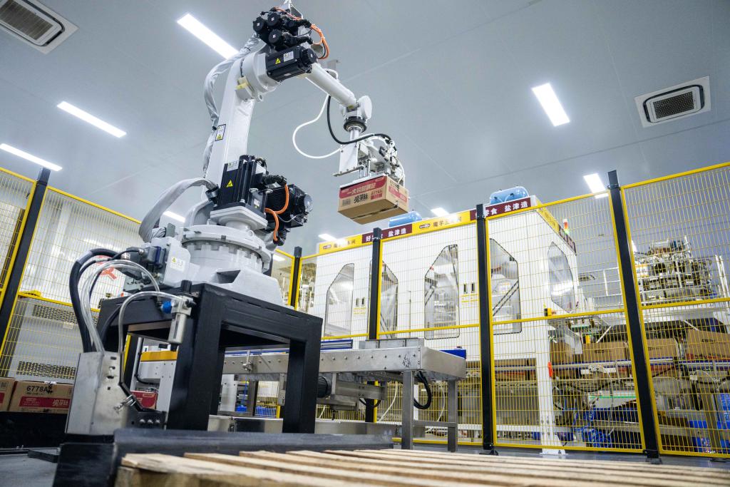 2023年11月23日,在浏阳市大魔王魔芋食品生产车间,工业机器人在运输产品。新华社记者 陈思汗 摄
