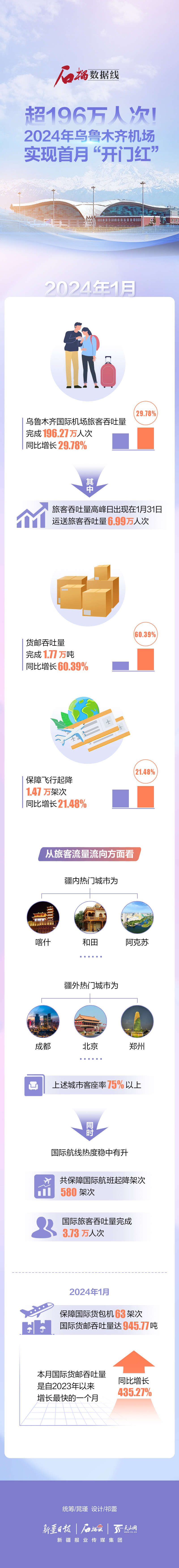 2024年1月,乌鲁木齐国际机场旅客吞吐量完成196.27万人次,货邮吞吐量完成1.77万吨,保障飞行起降1.47万架次,同比分别增长29.78%、60.39%、21.48%。其中旅客吞吐量高峰日出现在1月31日,运送旅客吞吐量6.99万人次。