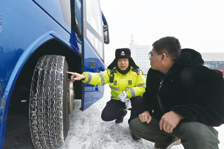 2月7日,乌鲁木齐市公安局交警支队民警对辖区客运企业开展全面检查。民警重点检查客运车辆安全带、安全锤、灭火器、防滑设备等安全设施配备和客运企业安全责任制落实情况,并向驾驶人开展安全警示教育,讲解超速、疲劳驾驶等交通违法行为的危害性,坚决杜绝车辆“带病上路”,确保春运期间道路交通安全。图为乌市公安局交警支队沙依巴克区大队西北路中队民警在辖区客运企业检查车辆轮胎磨损程度。