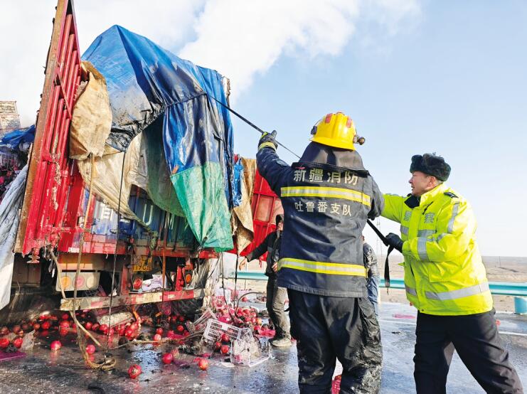 近日,在G30线3362公里处,一辆重型半挂牵引车因电路老化发生自燃。吐鲁番市高昌区公安局交警大队民警接警后赶到现场,立即采取封控部分路段、设置安全警戒区域、分流现场车辆等措施,配合消防救援人员做好灭火工作。明火被扑灭后,民警联系道路养护部门清理路面。经过多个部门的通力合作,3个小时后,道路恢复畅通。