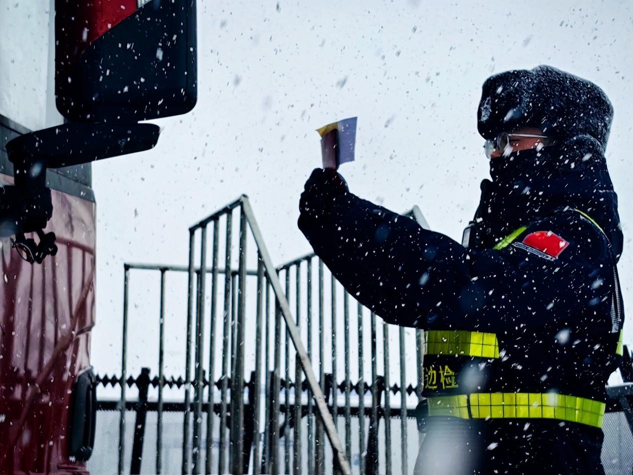 2月16日,新疆出入境边防检查总站塔克什肯出入境边防检查站民警对出境车辆进行检查。当日,当地遭遇暴雪天气,该口岸第一时间启动恶劣天气应急预案,确保通关安全顺畅。 韩罕强 摄