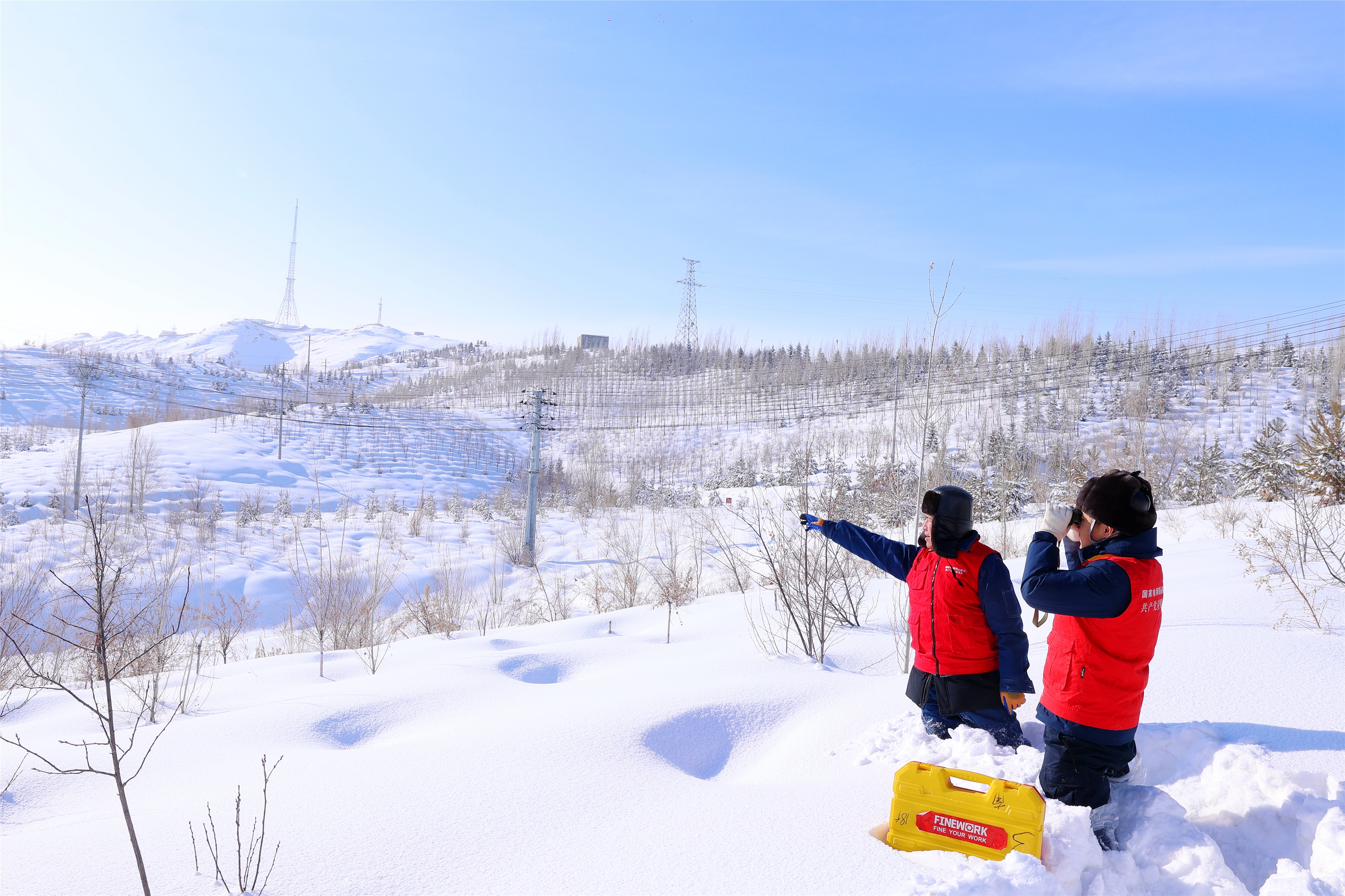 2月17日,国网新疆电力有限公司阿勒泰供电公司工作人员在阿勒泰市区周边巡检线路,确保企业、居民在强寒潮天气期间用上放心电。 阿尔达克·拜斯汗 摄