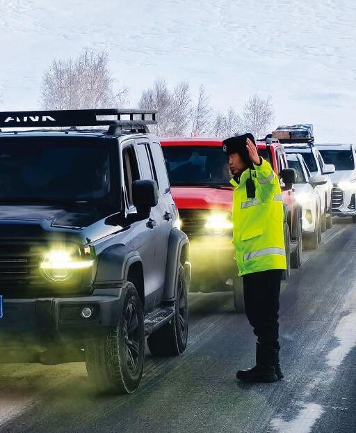 2月8日,喀纳斯景区公安局交警大队辅警图孟巴雅尔提示驾驶人停车等待。