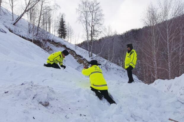 2月8日,喀纳斯景区公安局交警大队禾木交警中队民警测量推山雪。