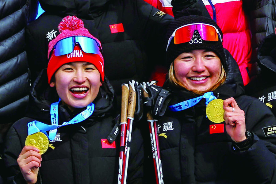 2月19日,迪妮格尔·衣拉木江(左)与巴亚尼·加林在展示金牌。当日,第十四届全国冬季运动会越野滑雪公开组女子团体短距离(自由技术)比赛在内蒙古乌兰察布凉城滑雪场举行,新疆队队员巴亚尼·加林与迪妮格尔·衣拉木江获女子团体赛金牌。石榴云/新疆日报记者 蔡增乐 摄