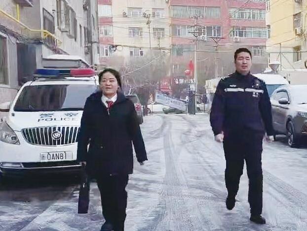 2月7日,李露(左一)与法警王旭光寻找被执行人。