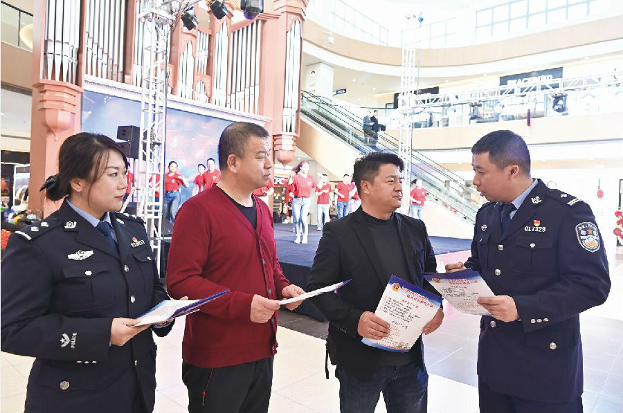 2月20日,乌鲁木齐高新区(新市区)文化体育和旅游局在杉杉奥特莱斯开展系列文艺惠民演出。现场,乌市公安局高新区(新市区)分局二工乡派出所民警向观看演出的群众发放反诈宣传单,提醒大家提高警惕,守好自己的“钱袋子”。石榴云/新疆法治报记者 单坤 摄