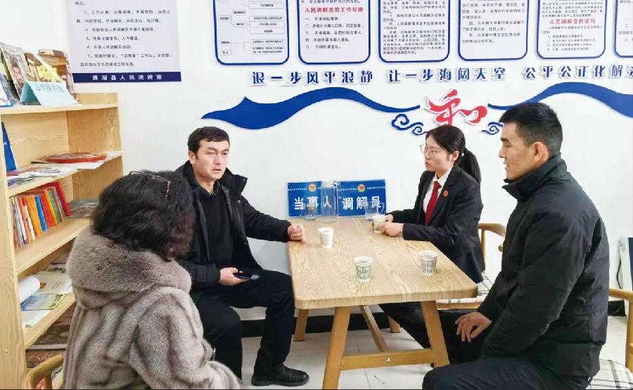图为法官在科克莫墩村调解室解答群众法律咨询。