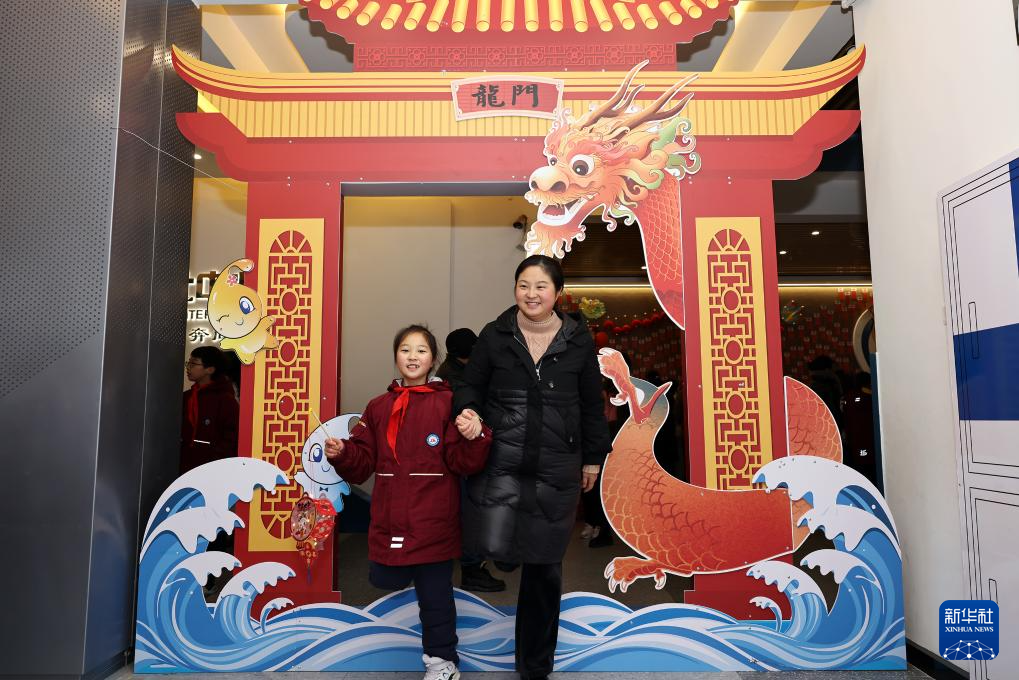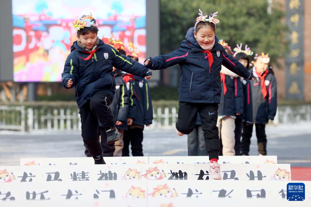 2月25日,在浙江省东阳市江北中心小学,家长和学生参加跨龙门活动,在体验传统文化的过程中迎接新学期。新华社发(胡扬辉摄)