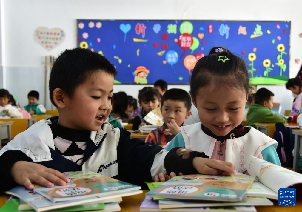 2月25日,云南省红河哈尼族彝族自治州个旧市绿春小学学生在翻阅新课本。新华社发(薛莹莹摄)