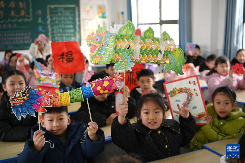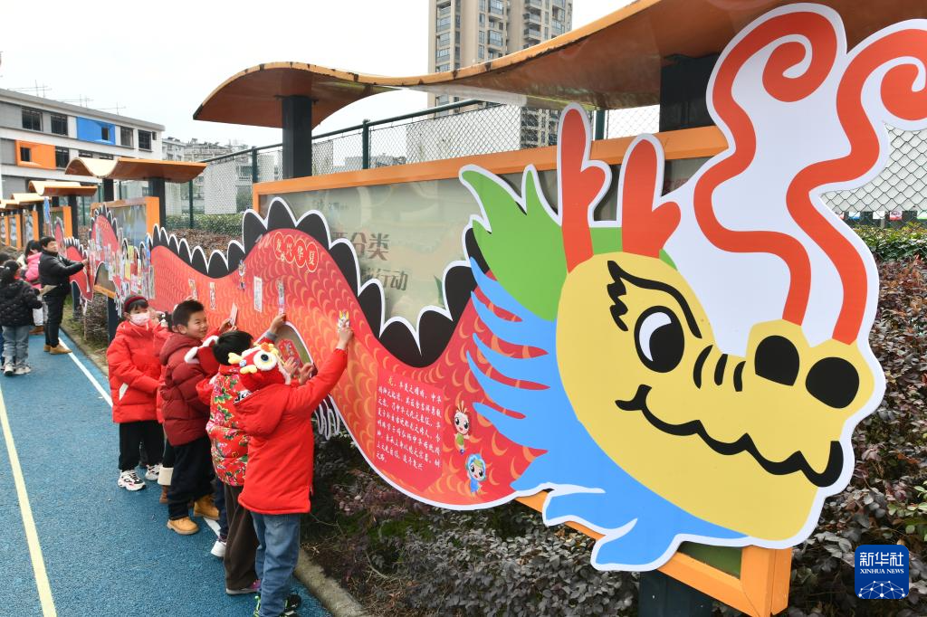2月25日,浙江省建德市明珠小学学生在张贴龙年手工作品,迎接新学期的到来。新华社发(宁文武摄)