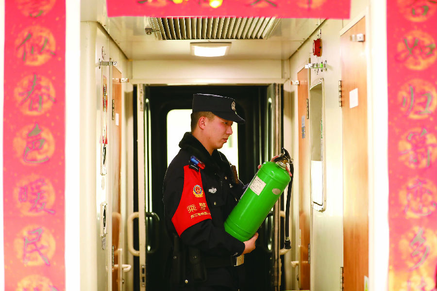 20时50分,列车启动。艾力亚与列车工作人员开完治安联防会议便开始巡视车厢,他一边检查列车里的消防设备,一边开展安全乘车宣传。
