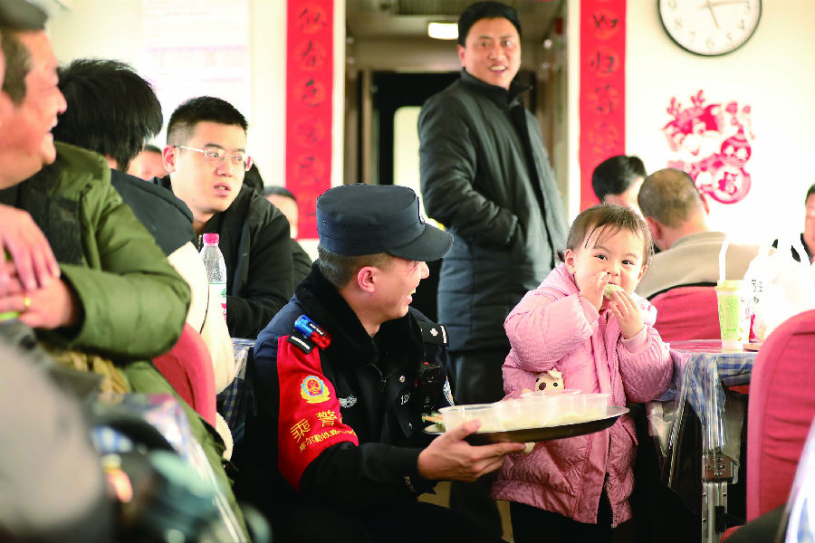 上车前,艾力亚的妻子给他准备了马肉和饺子送到车站。除夕夜,艾力亚从餐车的冰箱里拿出爱心晚餐,又备了些小菜、水果,叫上辅警和列车工作人员一起吃了顿年夜饭。