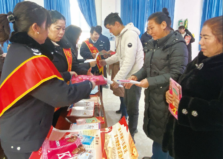 A+ | a2月26日,温宿县司法局工作人员来到恰格拉克乡招聘现场,为求职者送上一份“法治礼包”。