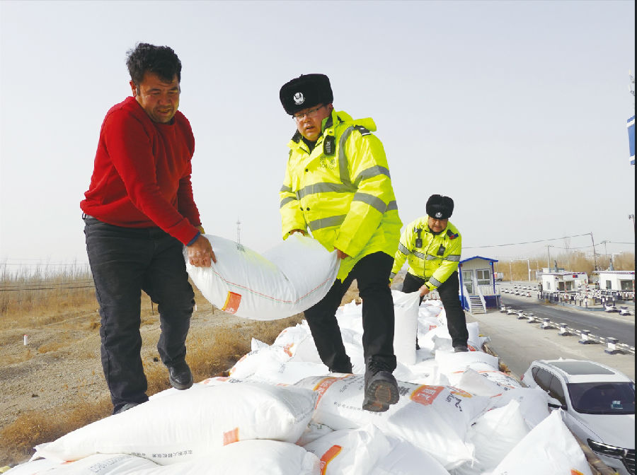 2月27日,库尔勒市公安局交警大队西尼尔中队民警在G218线开展“春季守护行动”,对运输化肥、种子、地膜等农用物资的大型货运车辆开展重点检查,排除安全隐患,提醒驾驶人遵守交通法规。图为民警帮驾驶人正确装载农资。