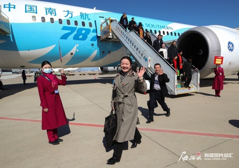 3月3日,出席十四届全国人大二次会议的在疆全国人大代表乘机抵达北京。天山网-新疆日报记者崔志坚摄