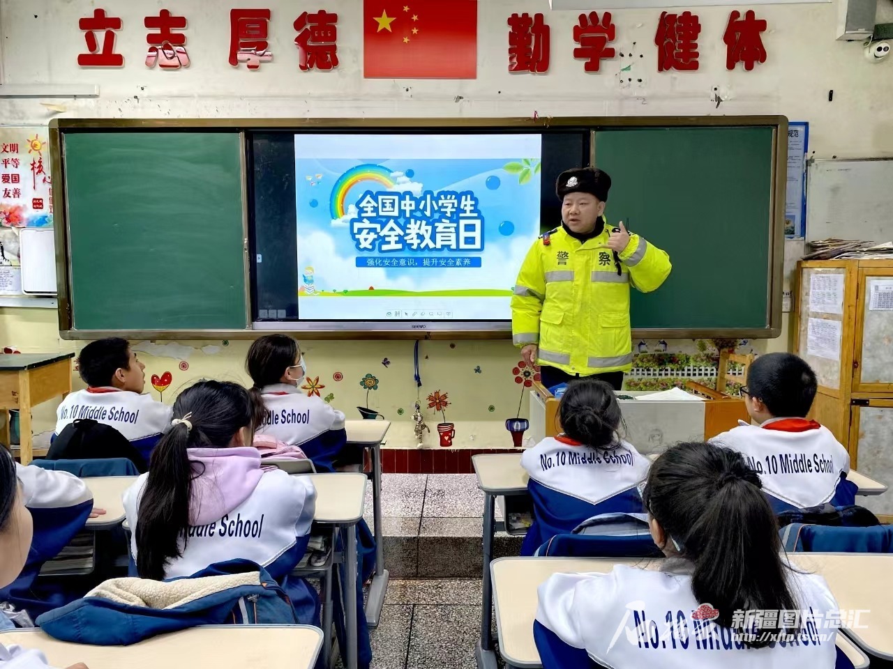 3月22日,在乌鲁木齐市第十中学,乌鲁木齐市公安局交警支队沙区交警大队长江路中队中队长马庆为学生讲解交通安全知识。罗克满摄