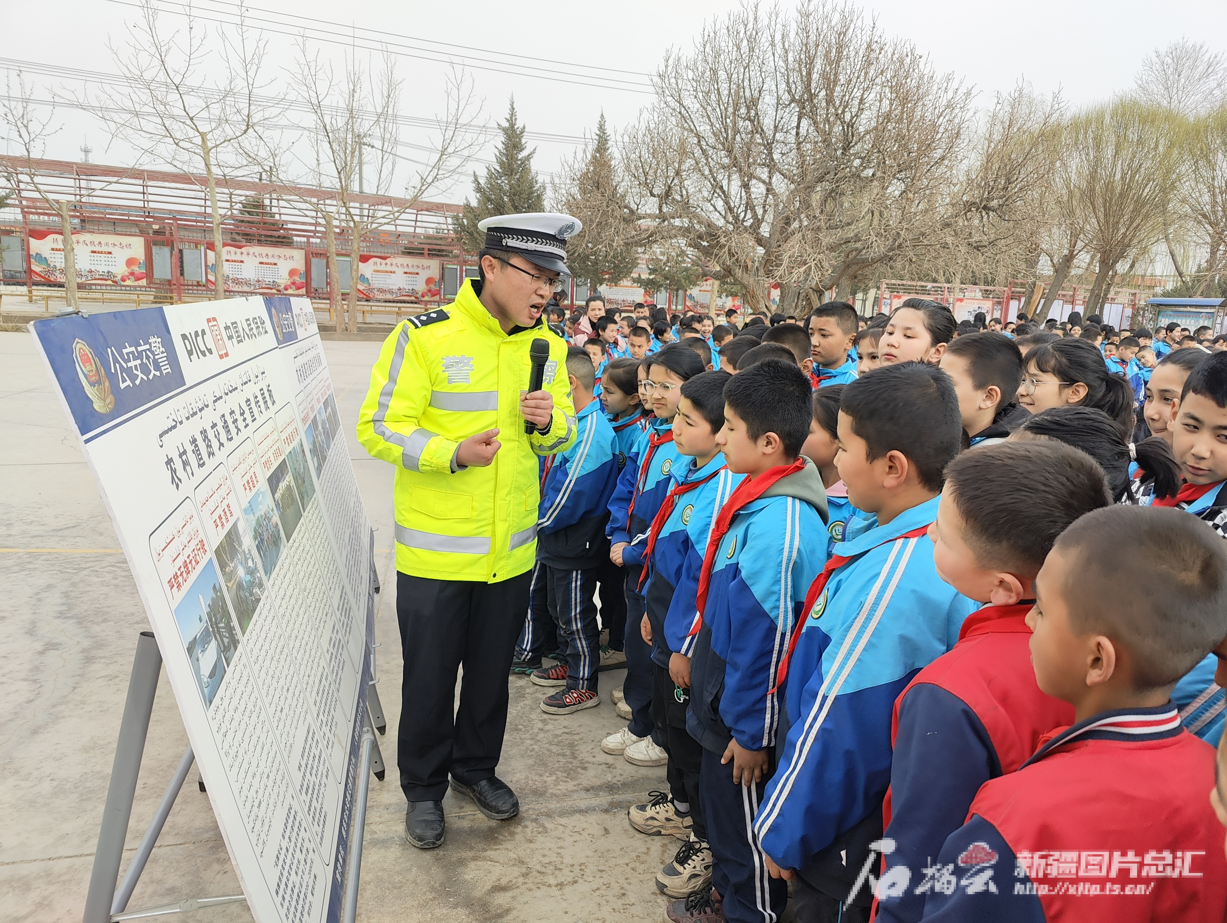 3月22日,在库车市乌尊镇中心小学,库车市公安局交通管理大队警官黄洋洋为学生讲解交通安全知识。段旭鹤 摄