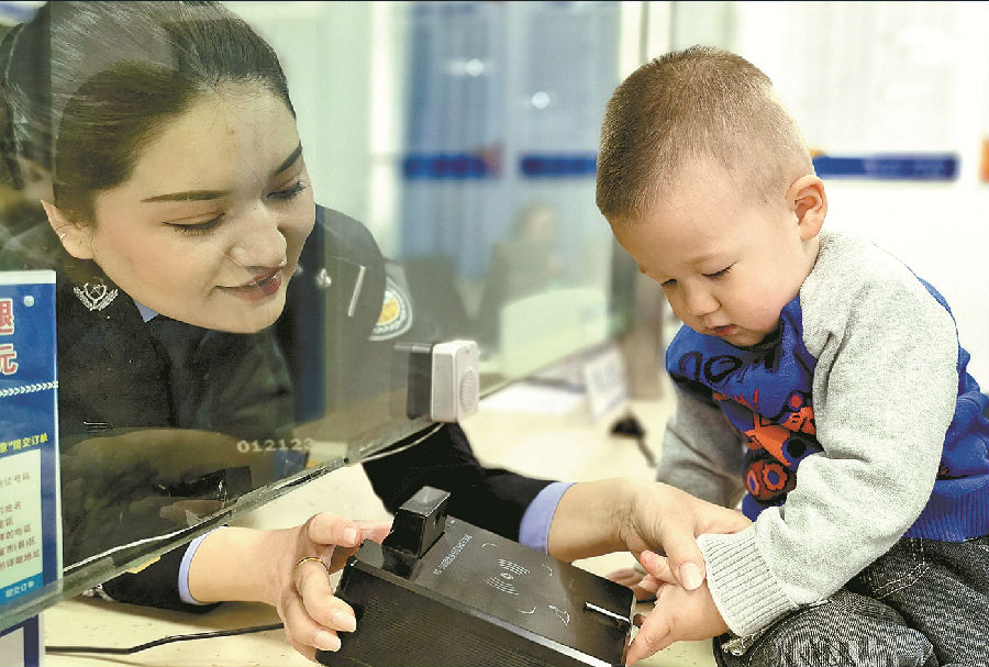 A+ | a3月25日,乌鲁木齐市公安局天山区分局综合服务大厅民警帮小朋友采集指纹。