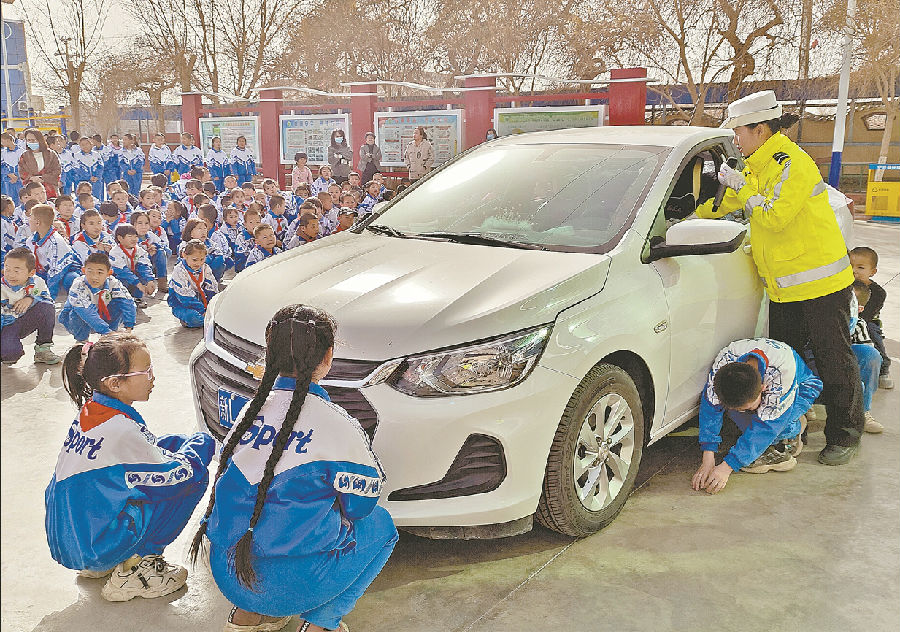 A+ | a为切实加强校园安全教育,增强广大中小学生法治意识和安全防范意识,3月20日,哈密市伊州区公安局交警大队民辅警来到巴里坤山南开发区火石泉学校开展交通安全宣传活动,为学生们送上一堂丰富多彩、妙趣横生的交通安全主题课,受到师生们的欢迎。图为民警教学生们识别车辆盲区。 刘冬冬 马晓琴 摄