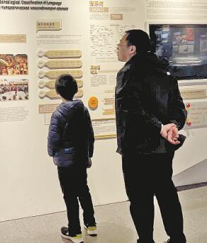 北京外国语大学世界语言博物馆内,一对父子正在参观。