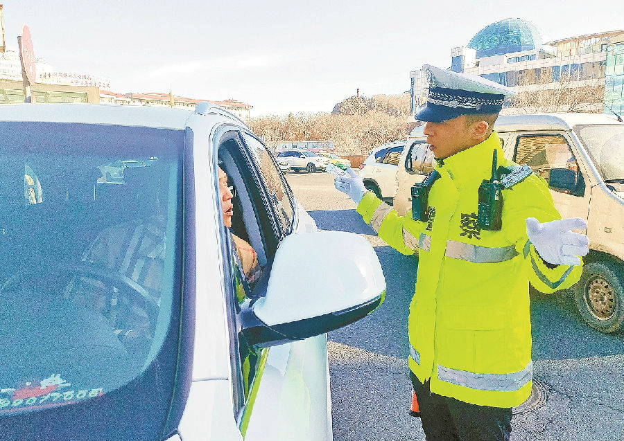 4月7日9时许,乌鲁木齐市公安局交警支队沙依巴克区大队友好路中队辅警,在红山环岛对随意变更车道的机动车驾驶人批评教育。